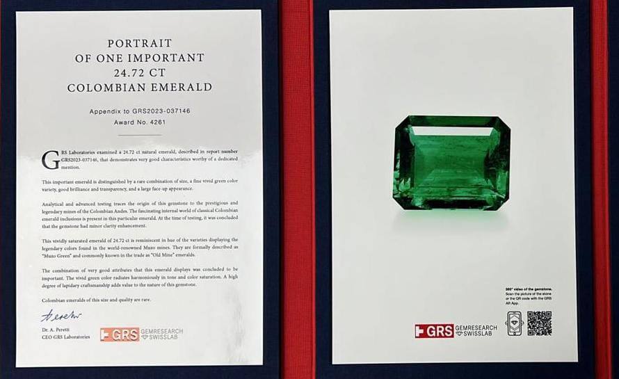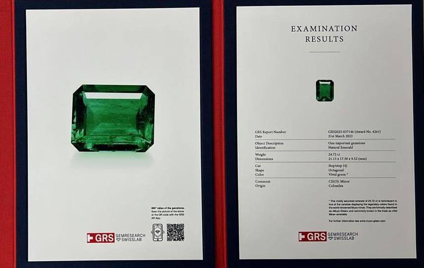 Advanced gemological analysis confirms the emerald’s origin as Colombia, a region renowned for producing some of the finest emeralds