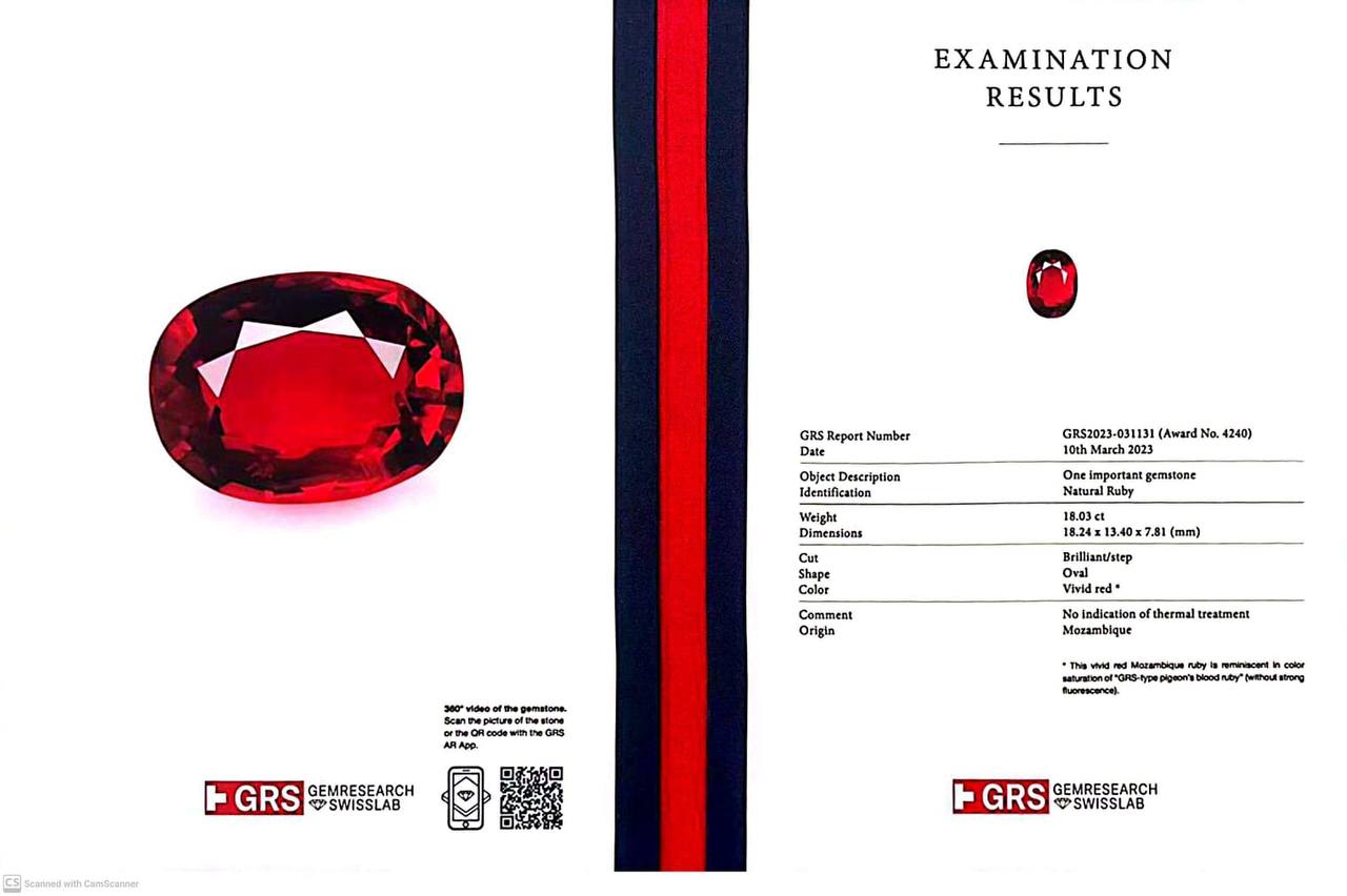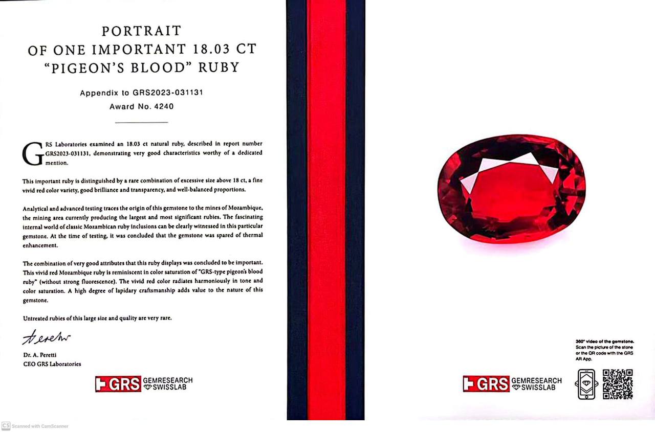 With its remarkable color, clarity, and untreated nature, this 18.03-carat Mozambique ruby represents a gemstone of outstanding quality.