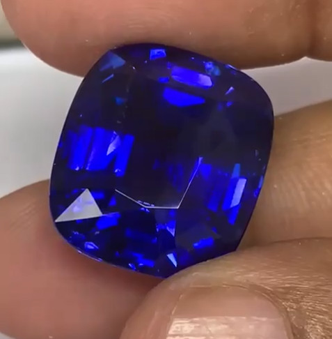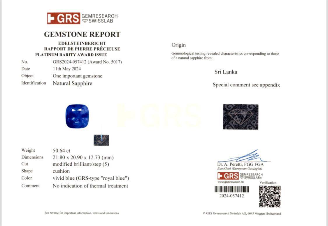 cut with a cushion shape, highlighting the stone’s brilliance and symmetry. Its color is described as light blue of the GRS “Royal Blue”